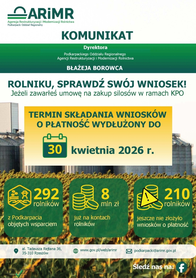 W związku z działaniami informacyjnymi dotyczącymi wsparcia dla rolników w ramach Krajowego Planu Odbudowy i Zwiększania Odporności (KPO), informujemy, że termin realizacji przedsięwzięć oraz termin złożenia wniosków o płatność został wydłużony z dnia 28 lutego 2026 r. do dnia 30 kwietnia 2026 r. Zmiana dotyczy inwestycji związanych z zakupem nowych silosów oraz elementów stanowiących ich integralną część, w tym wyposażenia, transportu i montażu.